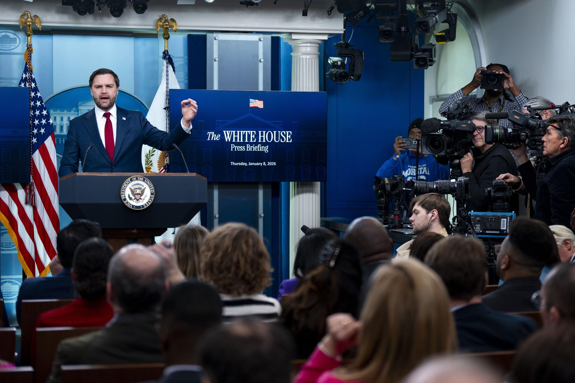 Washington (United States), 08/01/2026.- US Vice President JD Vance addresses the media in the James S Brady Press Briefing Room of the White House in Washington, DC, USA, 08 January 2026. Vance responded to questions on the welfare fraud scandal in Minnesota and the fatal shooting of a woman by an ICE agent in Minneapolis on 07 January. EFE/EPA/BONNIE CASH / POOL