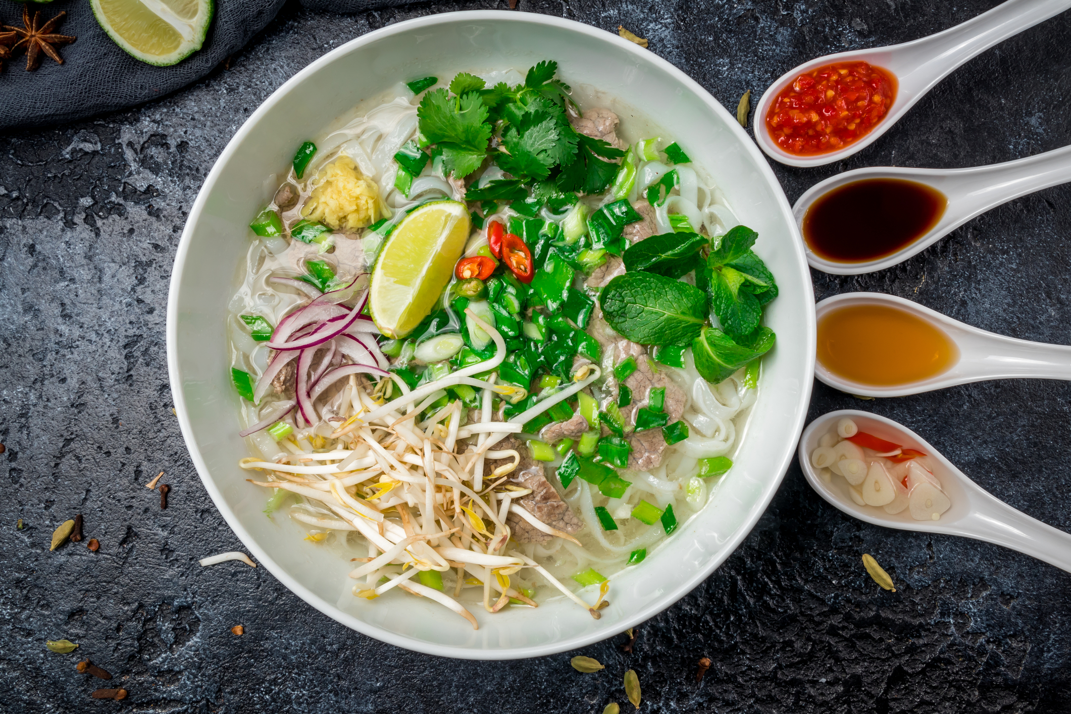 El pho es la sopa más famosa de Vietnam: un caldo aromático con fideos de arroz, hierbas frescas …