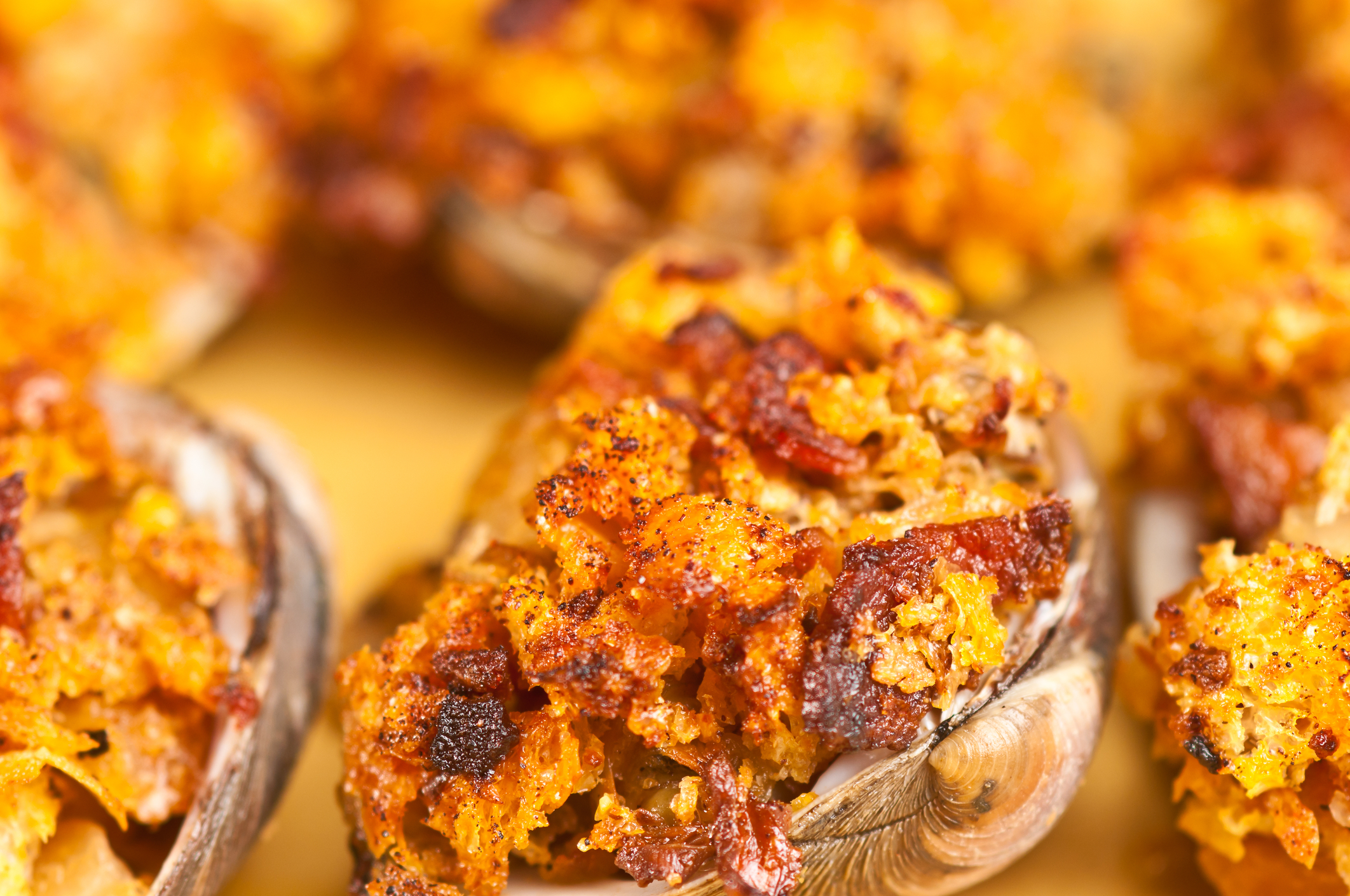 Clams Casino: almejas horneadas con tocino, mantequilla y pimientos
