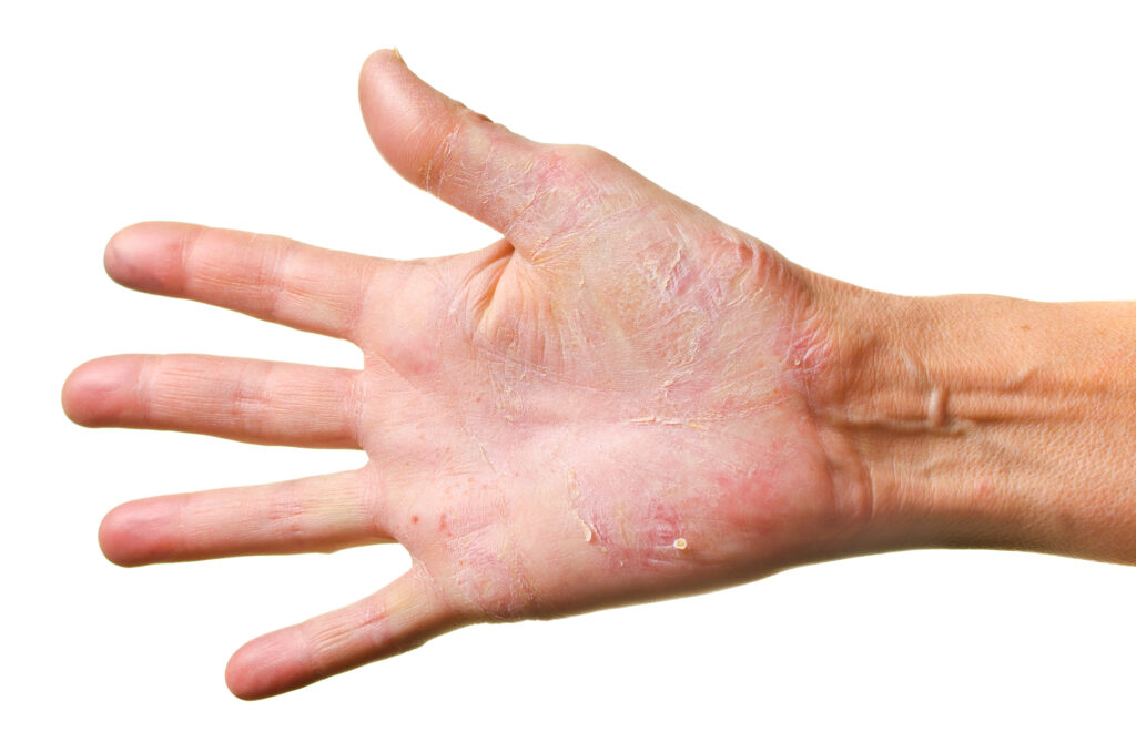 El eccema es una condición inflamatoria común que suele comenzar en la infancia. Se caracteriza por enrojecimiento, resequedad, picazón intensa y, en ocasiones, piel agrietada. A diferencia de la psoriasis, las lesiones del eccema suelen exudar líquido y se ubican con frecuencia en manos, cuello y pliegues de brazos y piernas.