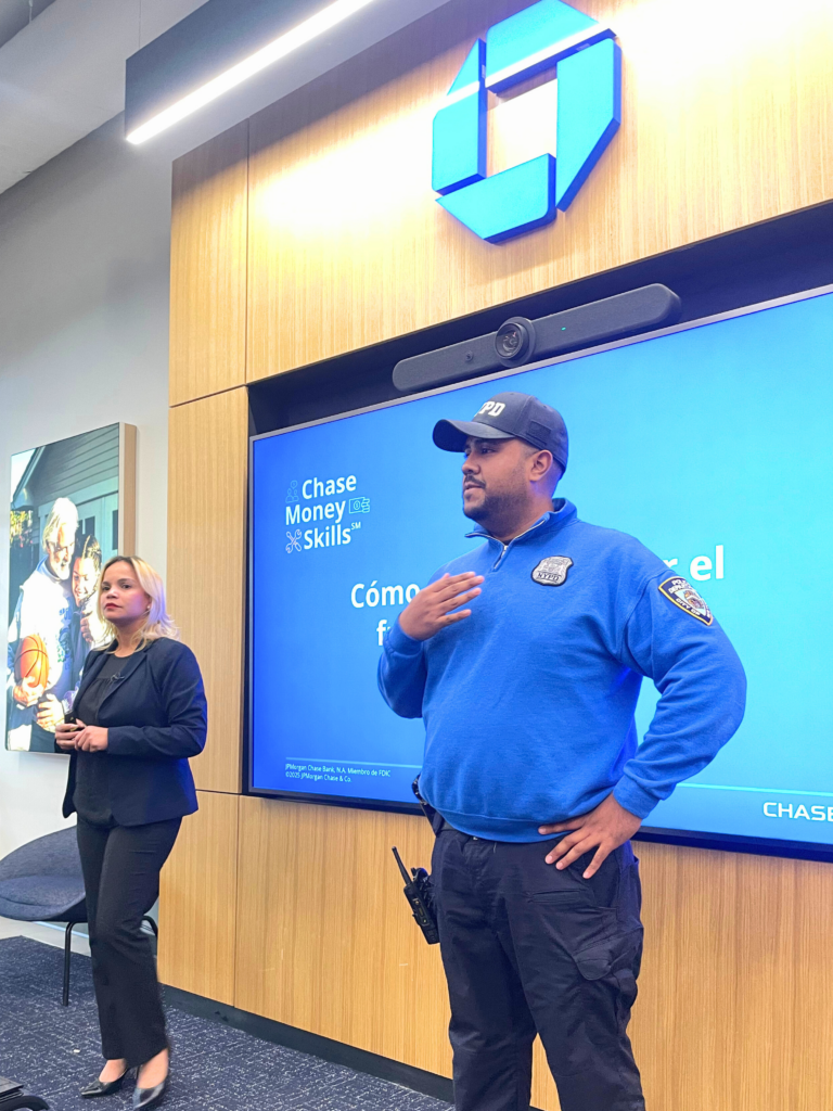 Ante este panorama, Chase y el NYPD organizaron un taller especial en español en la sucursal comunitaria de Chase en el Bronx. El objetivo fue claro: explicar cómo operan hoy los estafadores, qué señales deben alertar al público y cuáles son las medidas más efectivas para protegerse. La charla estuvo dirigida por Sherlyn Santana, gerente comunitaria de Chase y especialista en prevención de fraudes, junto al oficial Franco Escobar, de la División de Prevención de Crímenes del NYPD. Ambos compartieron ejemplos actuales y consejos prácticos para ayudar a la comunidad a reducir riesgos.