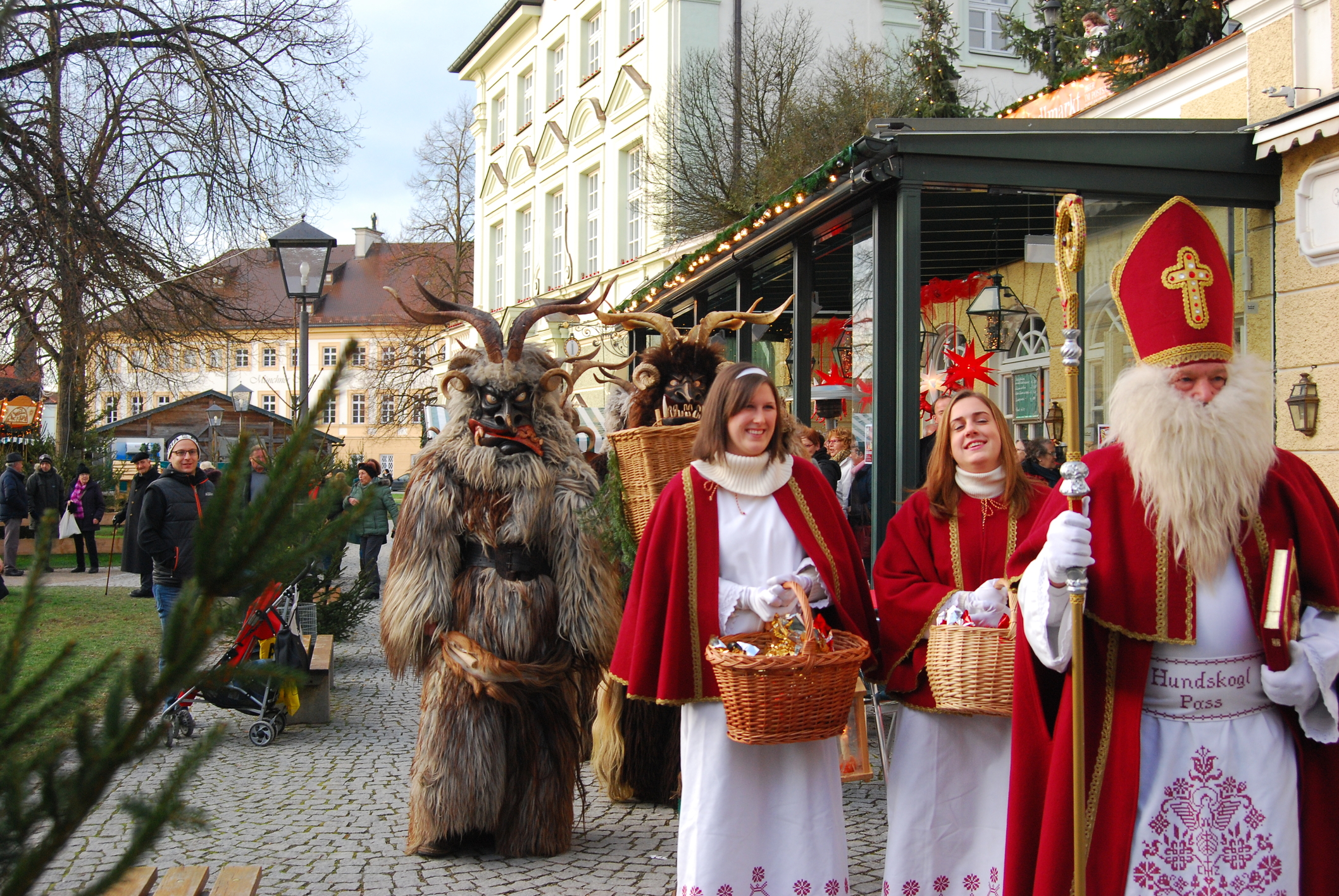 San Nicolás, los ángeles y Krampus. San Nicolás, junto con sus ángeles y Krampus, recorren la plaza Kapellenplatz en Altötting, Alemania, repartiendo dulces a los niños.Jesusfernandez | Dreamstime.com