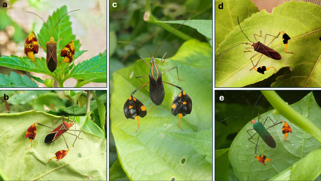 Combo de fotografías cedida por B. lurida, que muestra el comportamiento de cinco especies de chinches coreidas. a) Bitta lurida, b) Bitta hymeniphera, c) Diactor bilineatus, d) Bitta gradadia, y e) Anisoscelis foliaceus, en Colón (Panamá). EFE/ B. Lurida