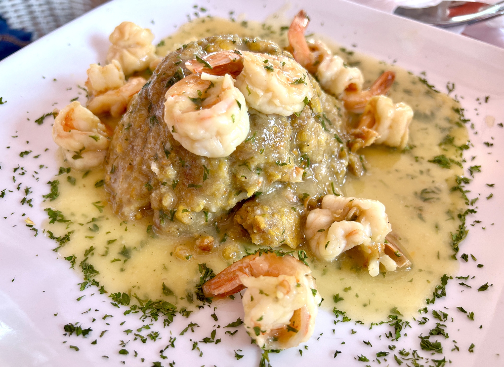 El mofongo con camarones en salsa de ajo es intenso, envolvente y profundamente satisfactorio, un plato que representa la esencia de la cocina boricua en cada detalle.