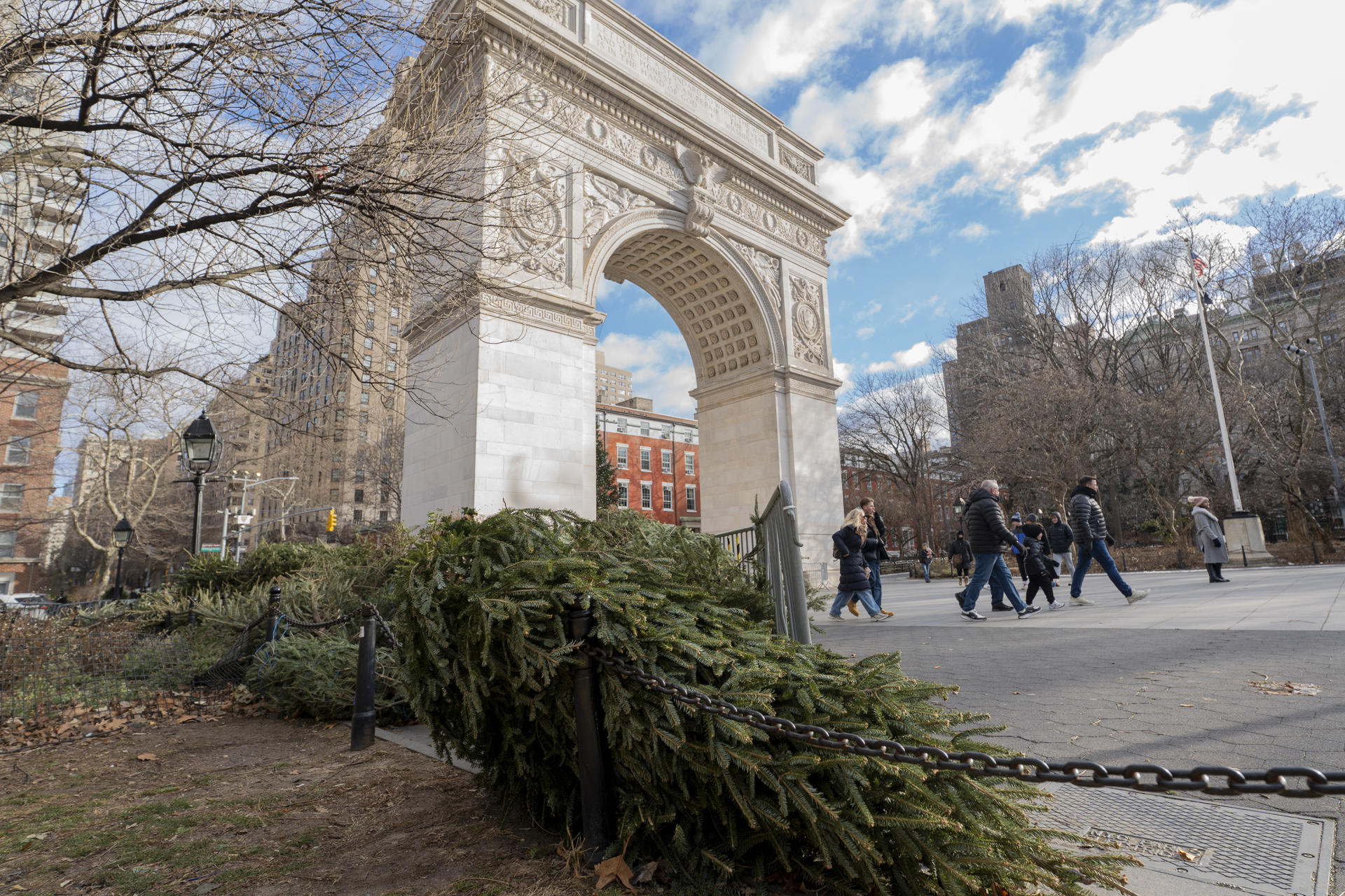 Bajo el arco de Washington Square Park, uno de los rincones más emblemáticos de Nueva York, aún brilla un árbol de Navidad de 14 metros cubierto de luces blancas. A pocos metros, sin embargo, la escena cambia por completo: decenas de abetos y pinos secos se amontonan en el suelo, formando un improvisado cementerio verde a la espera de ser reciclados.