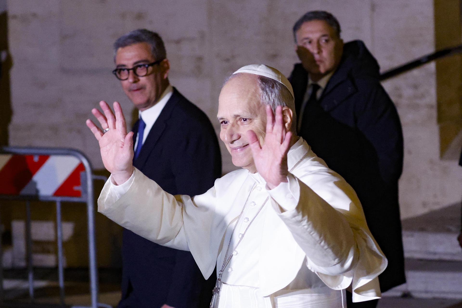 El papa León XIV (C) saluda durante una visita pastoral a la parroquia de Santa María Reina de la Paz en Ostia Lido, cerca de Roma, Italia, el 15 de febrero de 2026. Según el Vaticano, el papa León XIV visitará cinco parroquias de la diócesis de Roma, se reunirá con grupos parroquiales y celebrará misa cada uno de los cinco domingos de Cuaresma, comenzando por Santa María Reina de la Paz en Ostia Lido. EFE/EPA/FABIO FRUSTACI